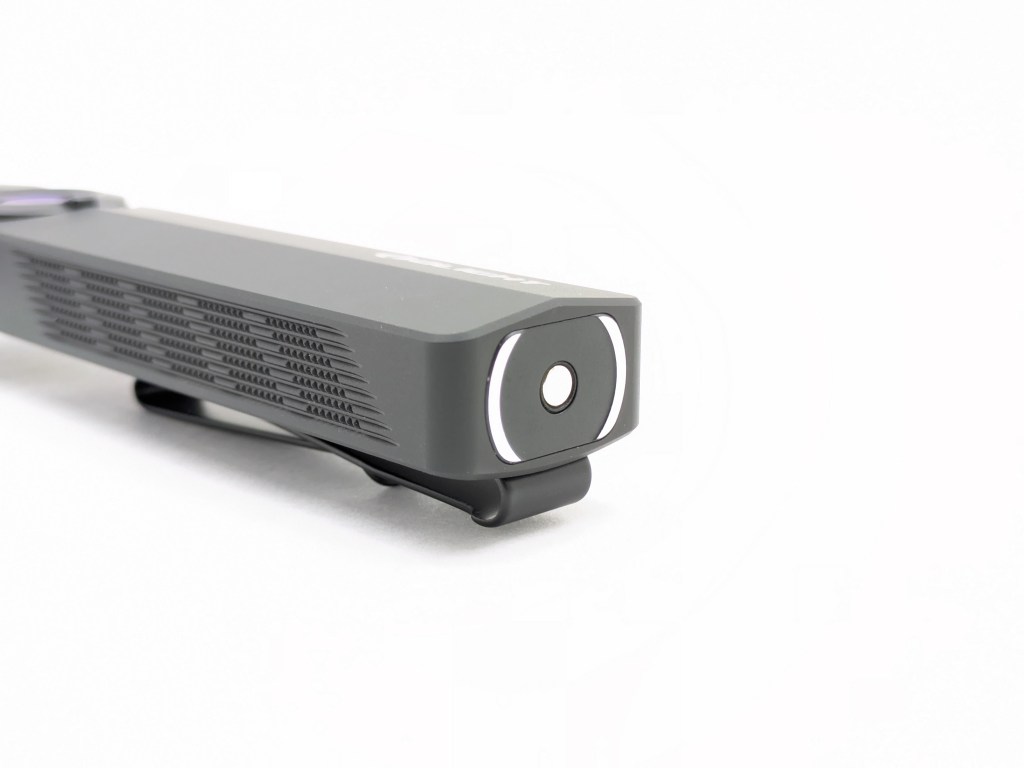 Olight declined to tell me which LEDs they’re using. I believe the spot LED is a Luminus SFT12. Unfortunately the other LEDs are covered by optics or a filter so I can’t see them. I got cool white because that’s what was available, but a neutral white option will be available soon. What I’d really love is a cool white throw LED and a ~4000K high-CRI flood LED. Between the two white LEDs, there’s a green laser diode on the bottom and a UV diode on top. That UV diode has a ZWB2 filter over it, which is a first for Olight. That blocks visible light, so you get more contrast and fine detail from the UV beam.