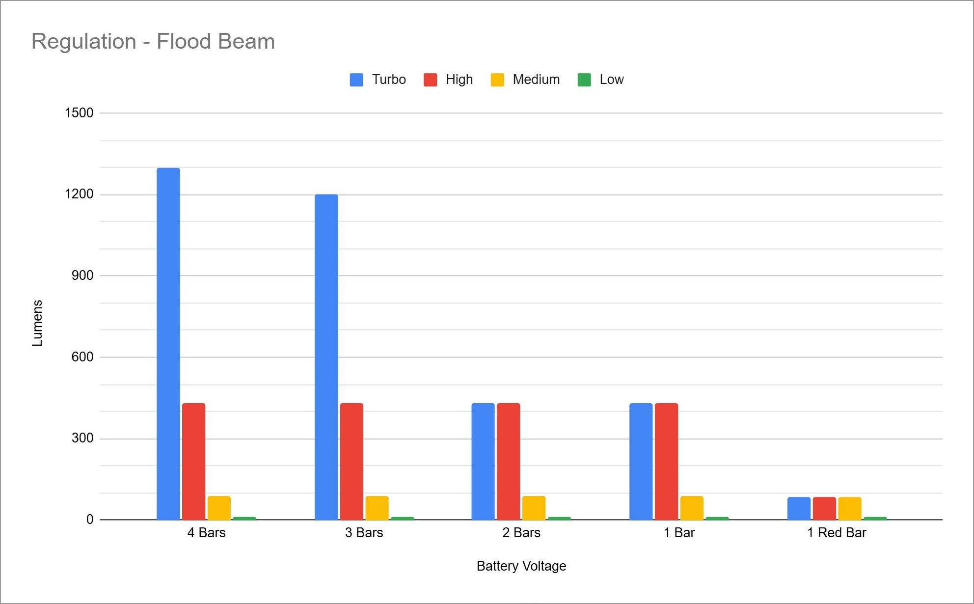 Regulation performance is poor. You completely lose access to Turbo mode below 50% battery. It doesn’t just get a bit dimmer like most lights. The mode just goes away. Olight has been doing this on most their lights for years. I don’t understand why and I strongly dislike it. The other modes are consistent until the battery is virtually empty.