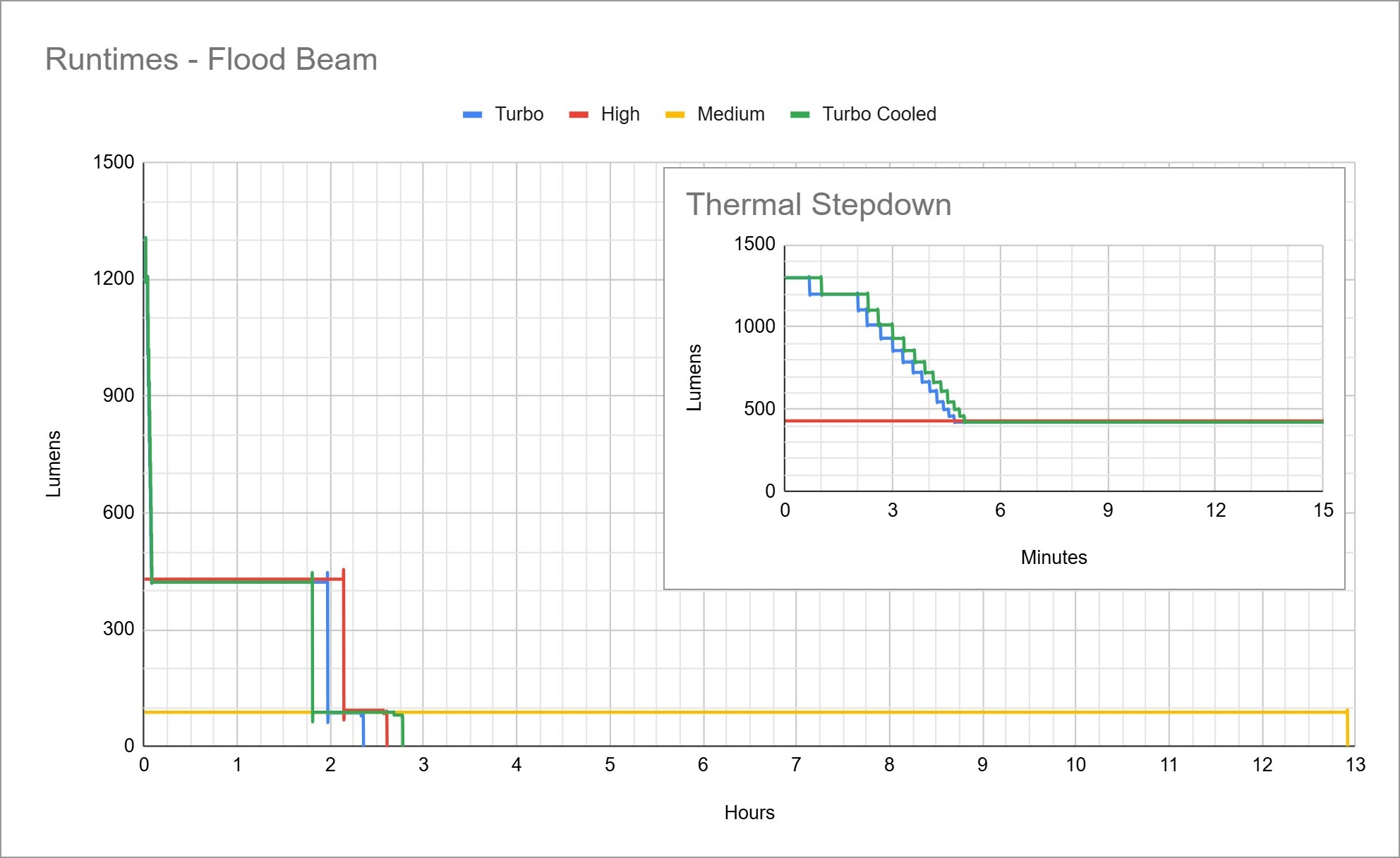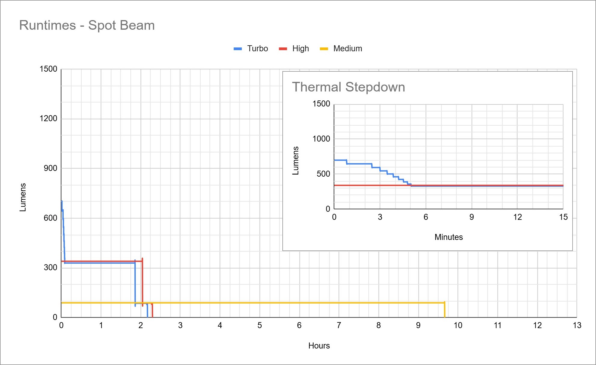 Performance is good and in line with most competitors. Sustained brightness is 400lm for 2hrs on the flood channel. Turbo lasts ~2 minutes before a slow stepdown. The spot channel is a similar story, just not as bright.