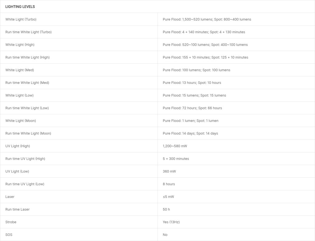 Disclaimer: All of my measurements are taken at turn-on. Lumen measurements were taken on a Texas Ace 3.5″ Lumen Tube. A candela measurement was taken at 10 meters with an Opple Light Master III on the highest brightness, and other candela figures were calculated relative to that. CRI, CCT, & DUV data were taken for each mode from a few feet away at the center of the hotspot with the Opple Light Master and Waveform DUV Calculator. Runtime tests were performed with the Ceilingbounce app on my smartphone. These tests were performed with a fully charged included battery unless otherwise specified. I cannot measure moonlight directly, so moonlight readings are calculated based on the brightness relative to the next-lowest mode. None of this is professional equipment, so take these measurements with a grain of salt.