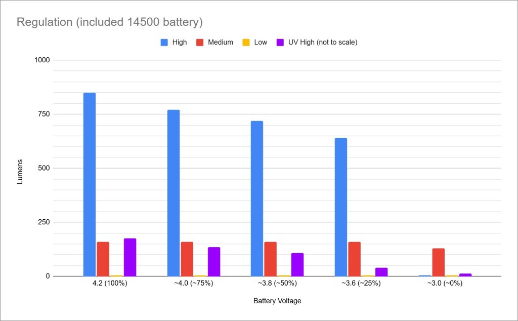 Regulation performance is good/average. It maintains most of the High mode brightness down to ~25% charge, and all the other white modes are flat down to 25% charge or less. That’s exactly what I want because it shows the components are high quality and they’re being pushed hard for great performance. The UV regulation is not as good, which is pretty common on combo lights like this one.