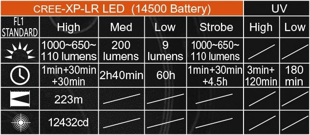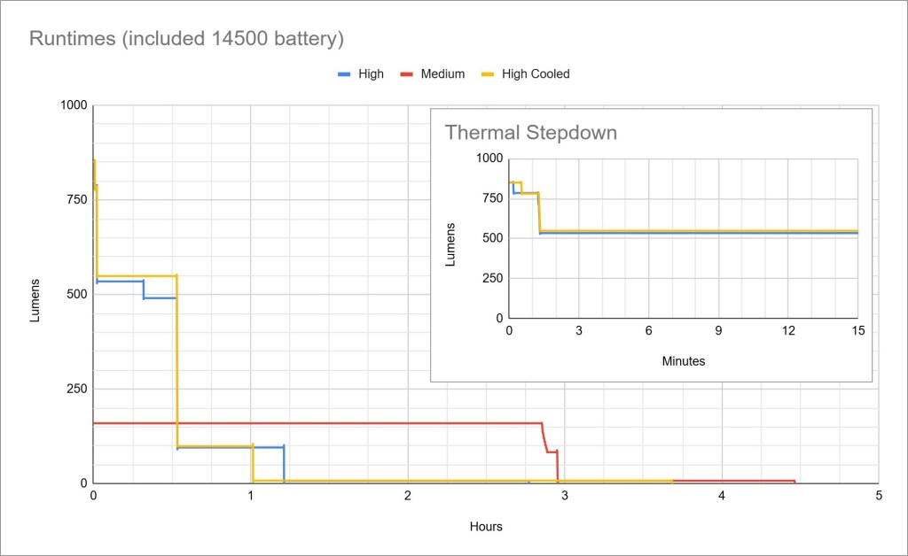 The performance impressed me. Sustained output is high for a 14500 light (~500lm) and I like how long Medium mode runs perfectly flat (almost three hours).