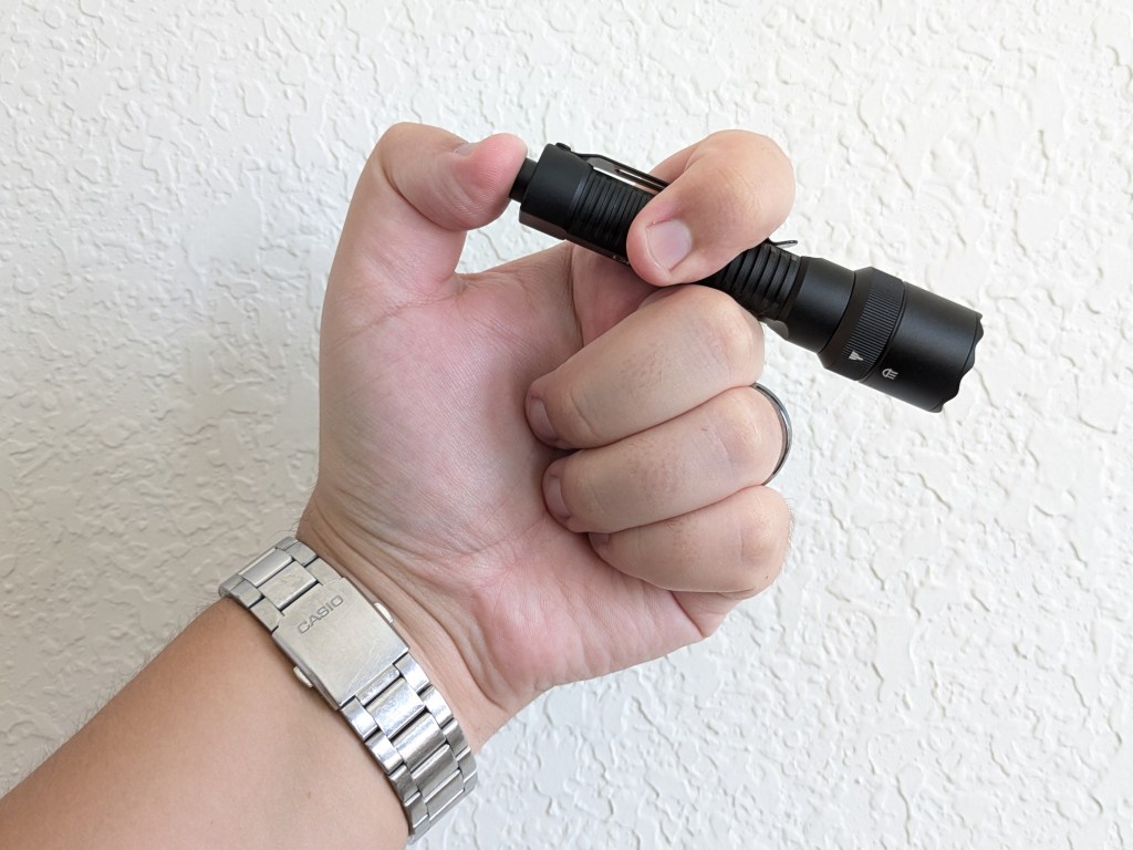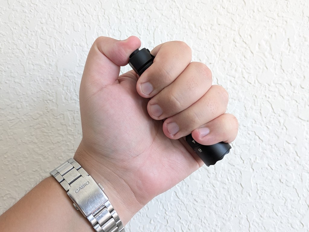 Ergonomics are good. It’s comfortable to hold and use in a reverse or cigar grip. There’s no one grip that lets you access both switches, but it’s small enough that turning it around in your hand isn’t cumbersome.