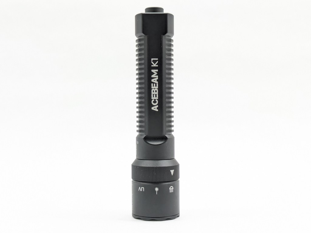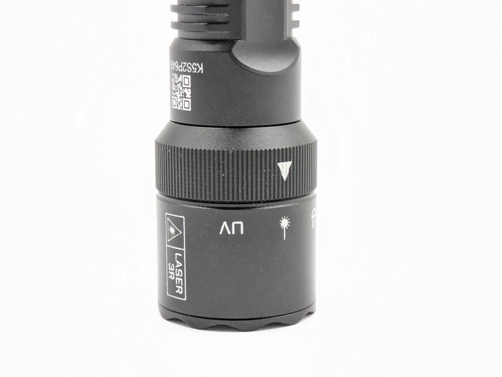 K1’s channel selector is 3-position rotary toggle on the head to choose between white light, laser, and UV. It’s easy to rotate with one hand and has good detents. I love when multi-channel lights have a dedicated selector like this. It’s so much more intuitive than a series of specific holds and clicks to change channel. My only complaint is it’s a little gritty and could be smoother.
