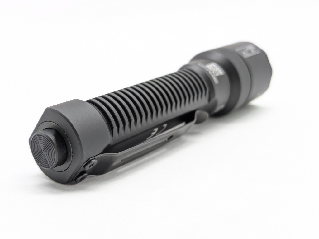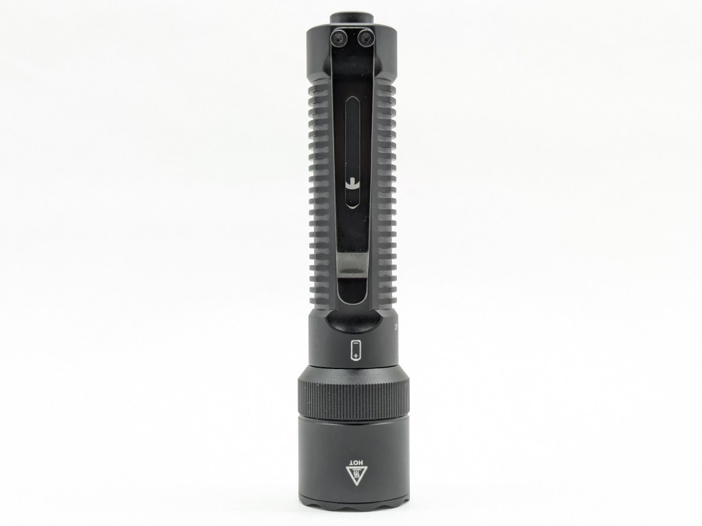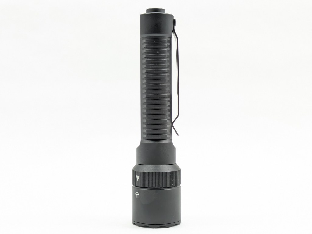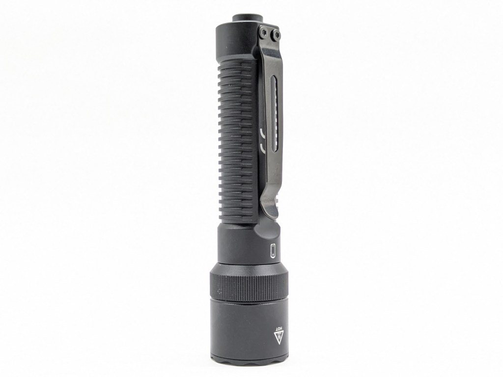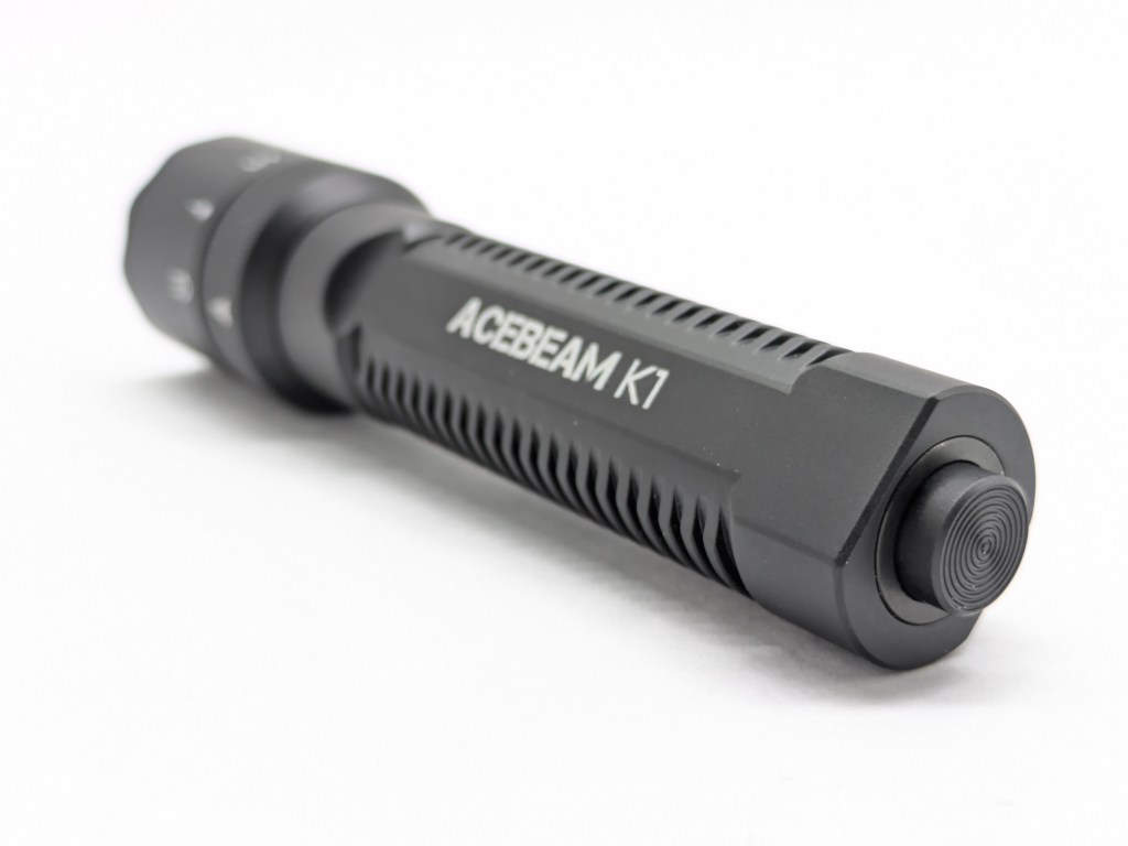 K1 is a traditional flashlight shape with a flared head and narrow body. It’s on the smaller side and the body has flat spots to make it carry a bit thinner. The screw-on clip and rotary selector on the head are nice touches.
