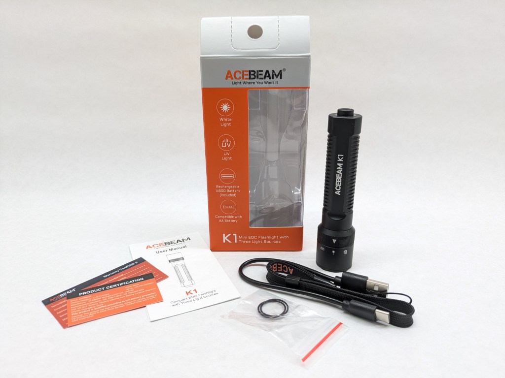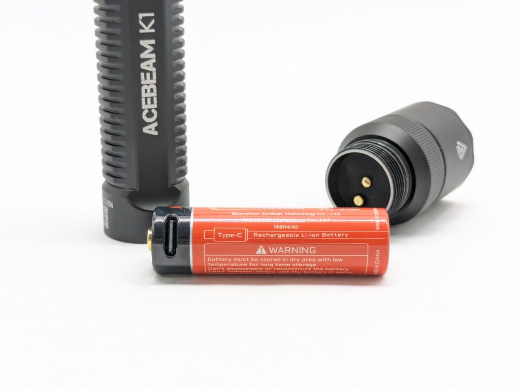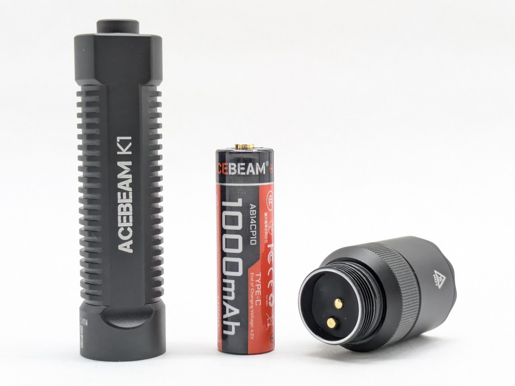 The battery included is an Acebeam-branded, 1000mAh, protected, button-topped, 14500 cell with an integrated USB-C charging port. Alternatively, K1 accepts standard Alkaline or NiNh AAs, but it won’t get as bright with those batteries. It has physical reverse polarity protection so you must use a button-topped battery, and there’s no LVP so protected cells are recommended. All of my testing is on the included battery.