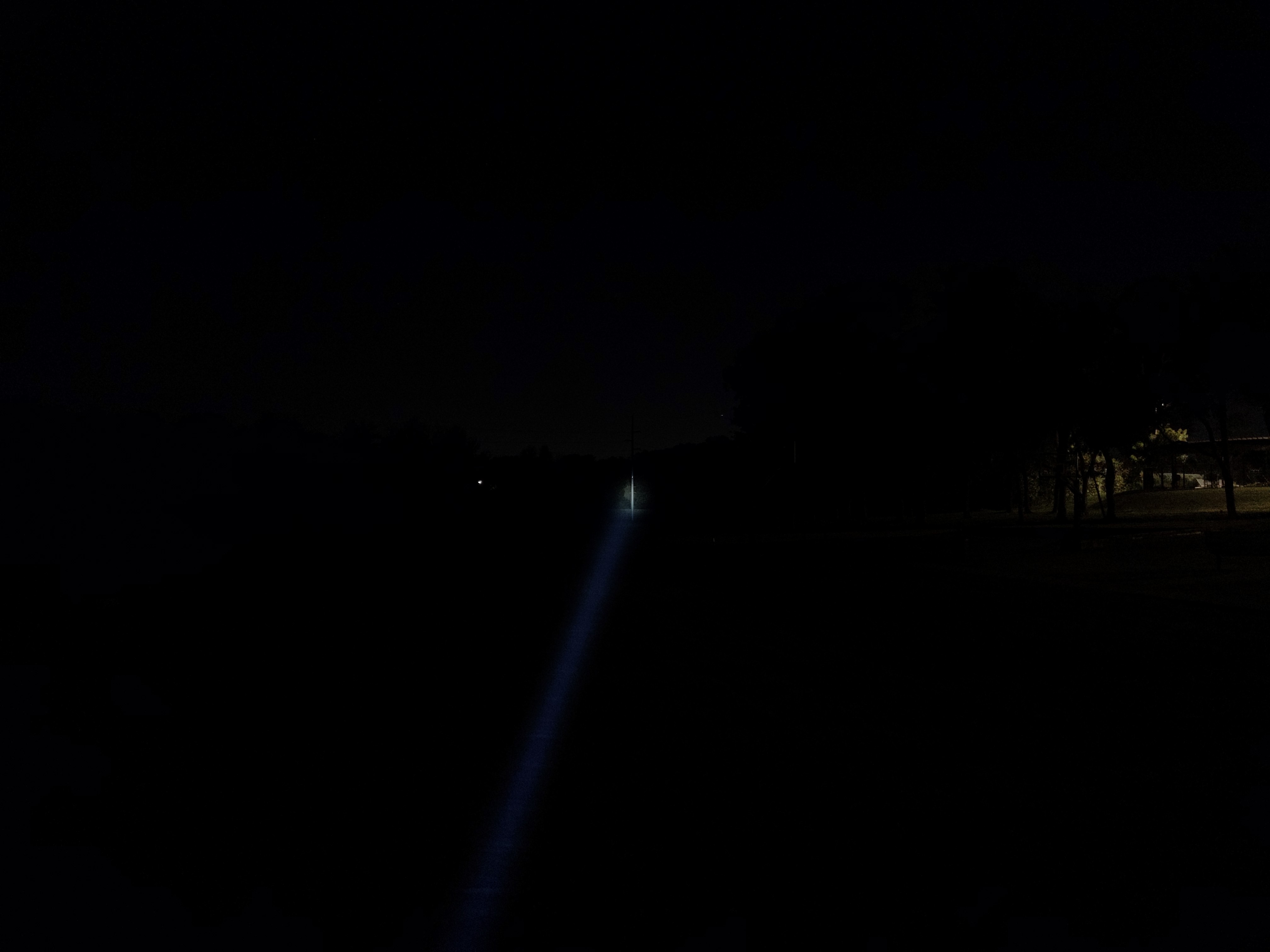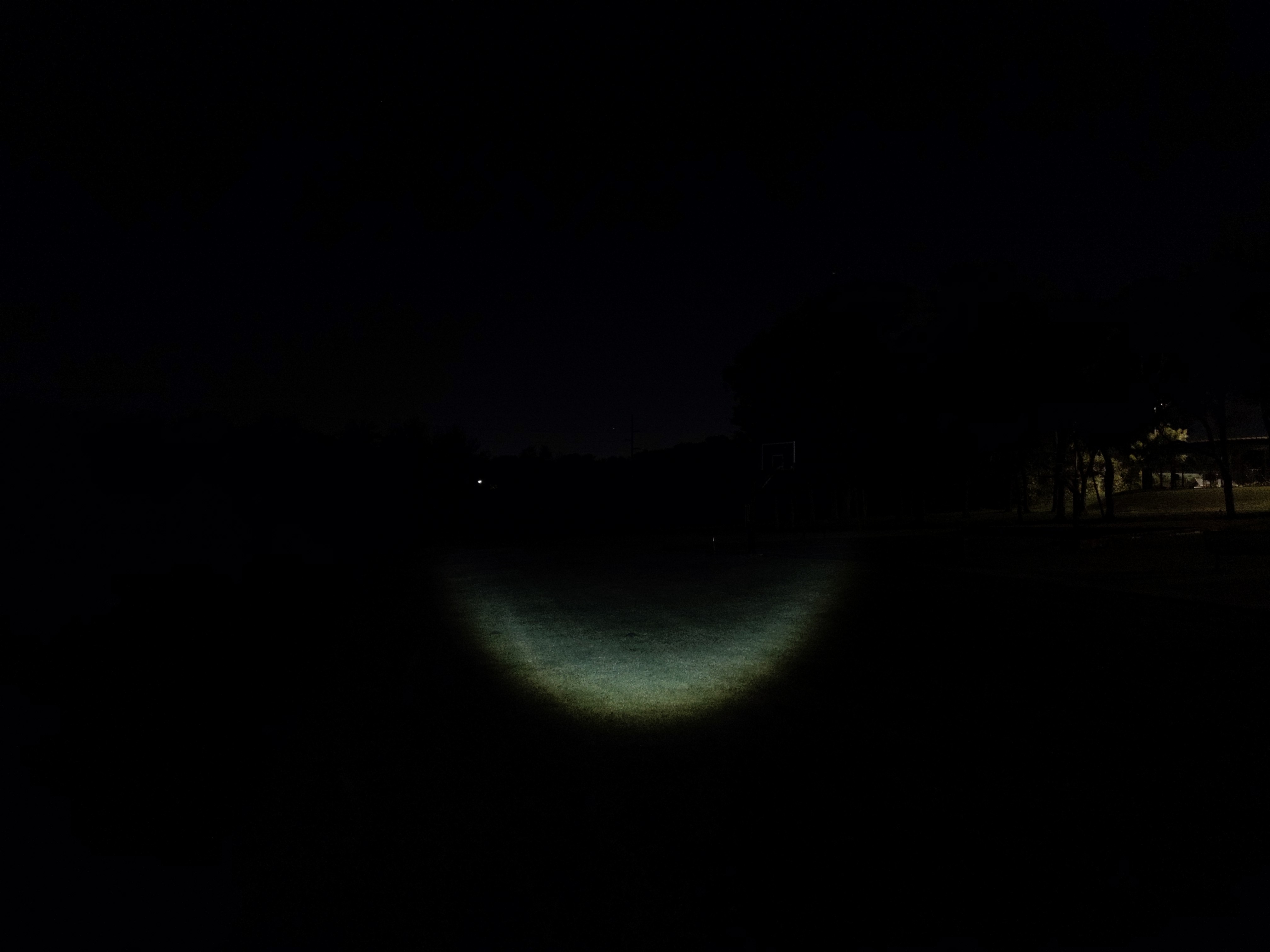 The zoomed-in beam is narrow and extremely intense, as you’d expect from an LEP. It’s good for reaching out extremely far and creating a visible beam in the air, but is not useful otherwise. Zoomed-out, the beam becomes a white circle with a dimmer center and brighter, yellow edges. It can illuminate wider area, but it still has no spill and it’s pretty dim overall. The flood beam is better than nothing, but it’s no substitute for a regular LED flashlight.