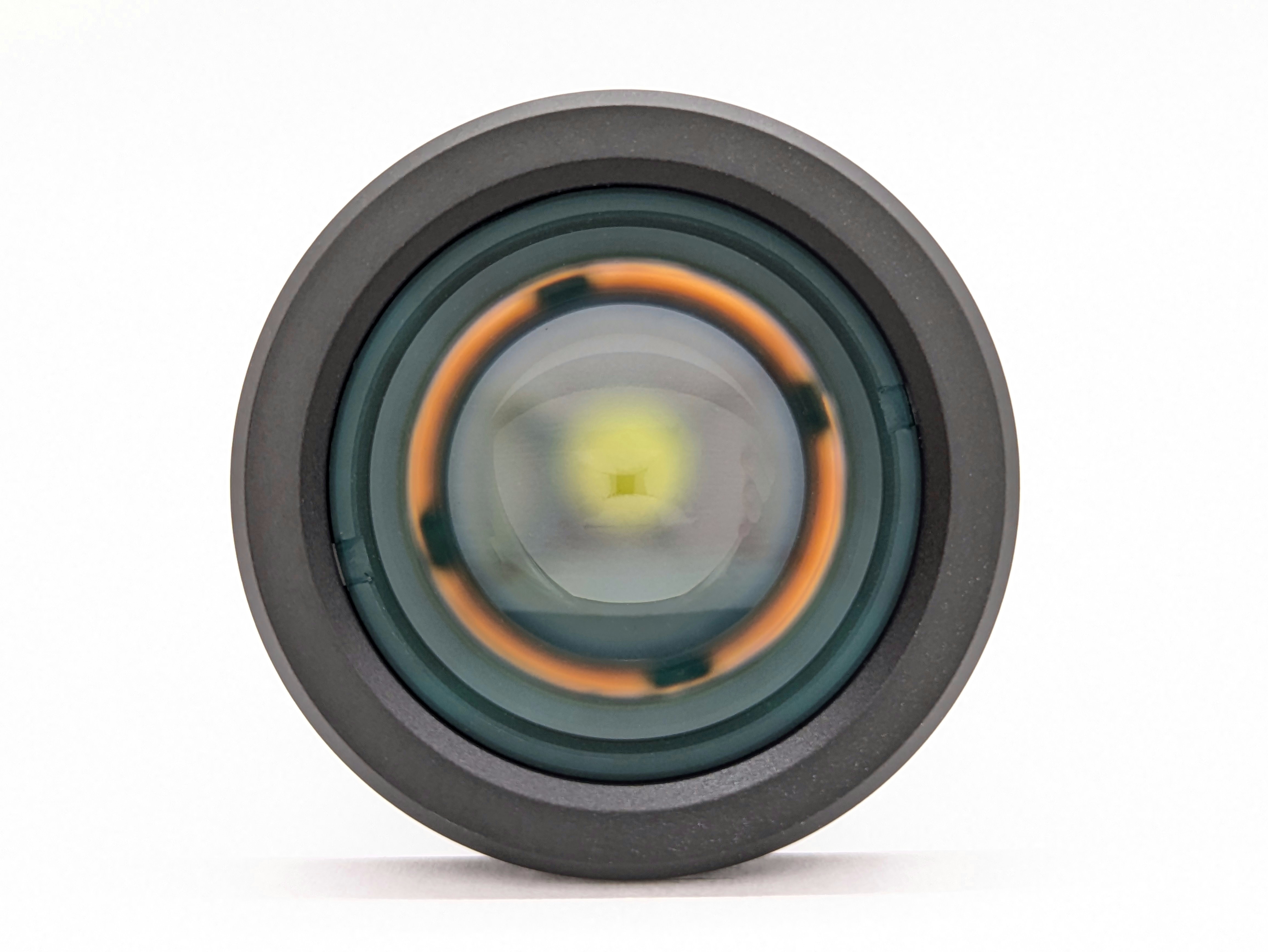 This is an LEP flashlight rather than an LED flashlight. In an LEP, a blue laser shines at a yellow phosphor to make an intense white light. Then that gets focused through a lens into a beam. In this case, that lens and therefore the beam are adjustable. Twisting the head zooms the beam in and out by moving the lens inside the light. The length of the light stays constant, which I haven’t seen on a zoomie before.