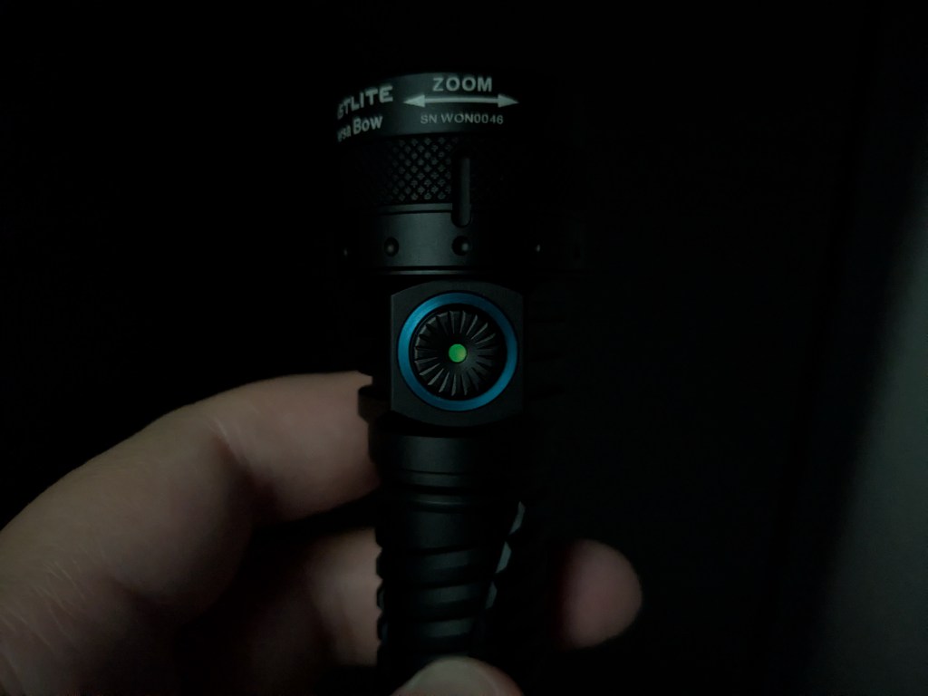 There’s a plastic e-switch on the side of the head. It’s a bit rattly but is tactile and audible. It sticks up so be sure to lock the light out in a pocket or bag. The center of the switch has an LED that glows bright during charging to indicate charging status, and it glows dimly the rest of the time. It’s so dim you can only see it glowing in near pitch black. The photo below makes it look brighter than it really is. You can turn it off by clicking 5x.