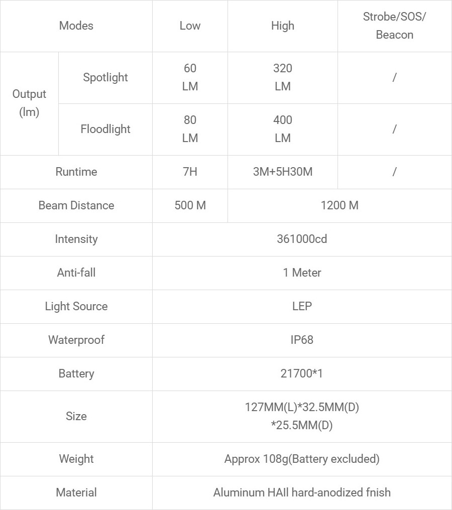 Disclaimer: All of my measurements are taken at turn-on. Lumen measurements were taken on a Texas Ace 3.5″ Lumen Tube. A candela measurement was taken at 25 meters with an Opple Light Master III on the highest brightness, and other candela figures were calculated relative to that. CRI, CCT, & DUV data were taken for each mode from a few feet away at the center of the hotspot with the Opple Light Master and Waveform DUV Calculator. Runtime tests were performed with the Ceilingbounce app on my smartphone. These tests were performed with a fully charged included battery unless otherwise specified. I cannot measure moonlight directly, so moonlight readings are calculated based on the brightness relative to the next-lowest mode. None of this is professional equipment, so take these measurements with a grain of salt.