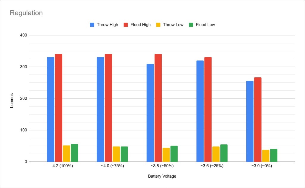 Regulation performance is great. It maintains most of the Turbo brightness down to ~0% charge.