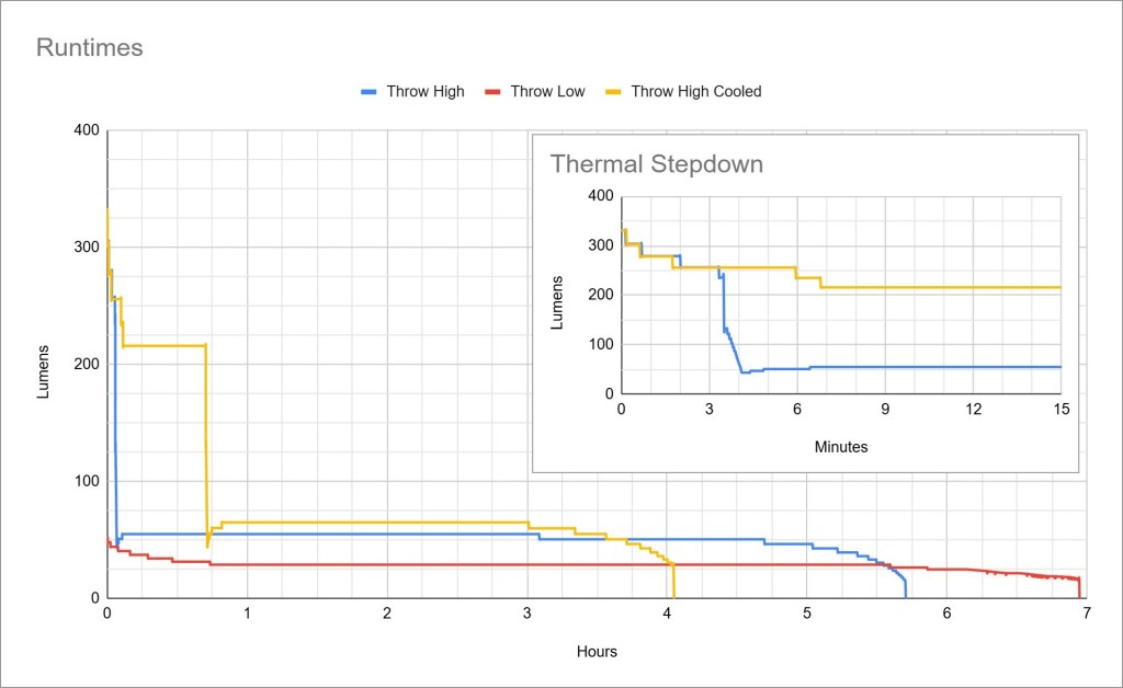 Thermal regulation: My Turbo Cooled test shows a significant increase in sustained brightness. This light has active thermal regulation that will adjust brightness to give you maximum performance without overheating, at least to a point. After 45 minutes the light steps down anyway but you still get a lot more brightness for that initial 45 minutes with active cooling or cold conditions.