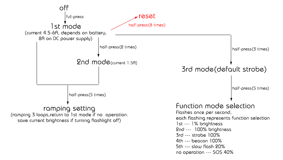 The “Ramping” firmware’s name is a bit misleading. It doesn’t ramp smoothly in normal use like Anduril does, for example. It allows you to select brightness levels using an infinite ramp and then those are your selected levels, rather than having different mode groups to choose from. Notably, the “Ramping” firmware has no thermal regulation nor mode memory. Below is a UI chart.